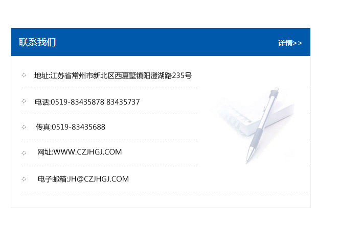 傳真:0519-83435688    郵編:213135    網址:WWW.czjhgj_com.cxjlmc.com    電子郵箱:JH@czjhgj_com.cxjlmc.com